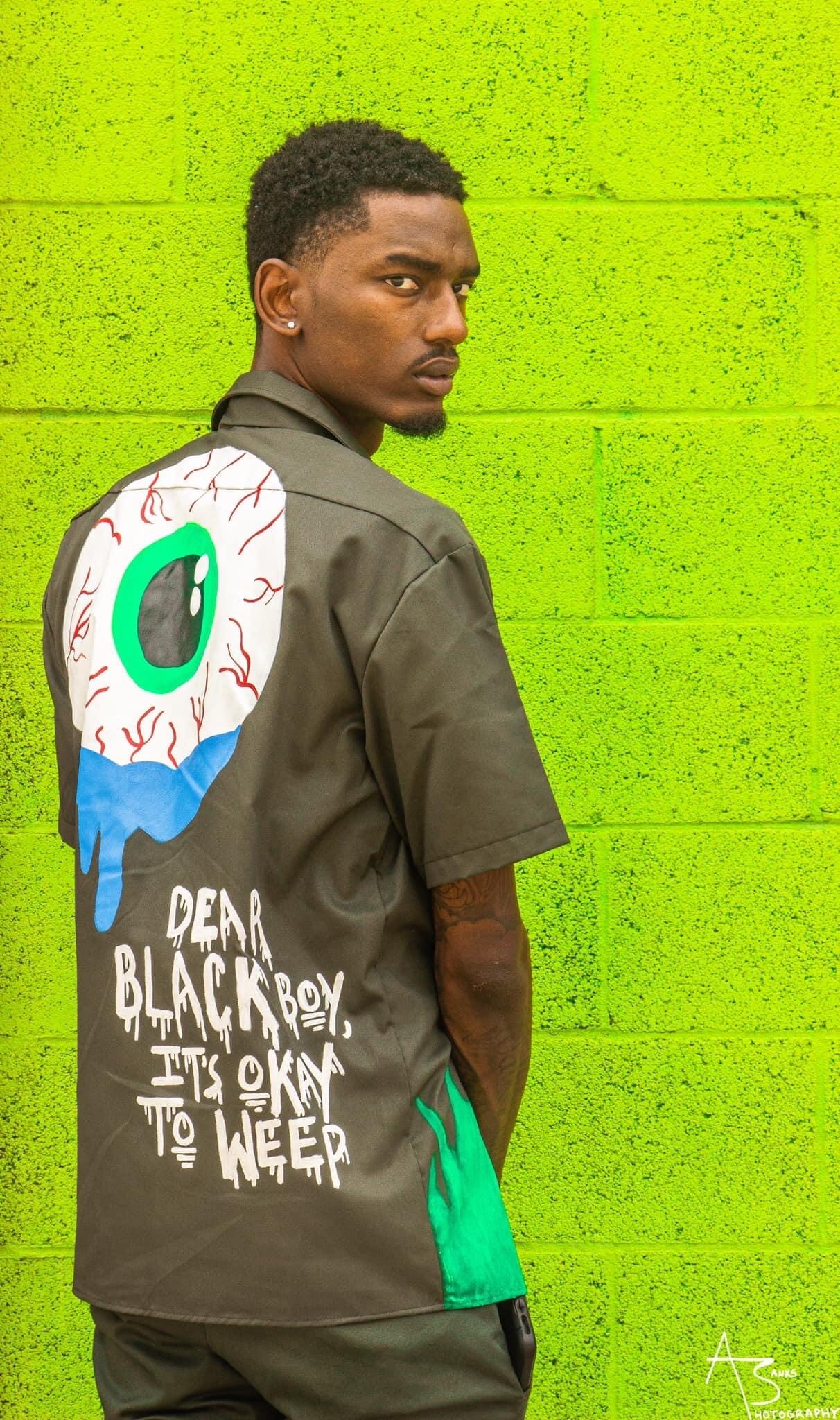 The back of the shirt, I painted Kaep and names of Black Kings and Queens that departed way too soon, due to police brutality. My very first fashion show was 7/27, and for the finale I had my model wear this piece, to close with me. I wanted the audience to see what I'm really about. I'm about us, always. I'm about keeping the conversation going, calling out sick agendas, twisted ways + pushing for change, opening eyes through art. I love Kaep, I wish I could just give him a hug, he's forever respected/loved for taking a knee.